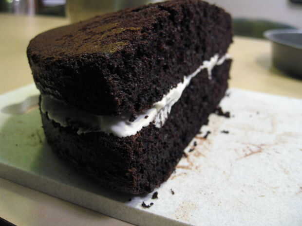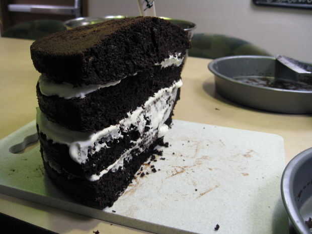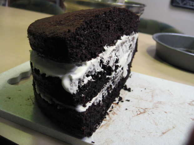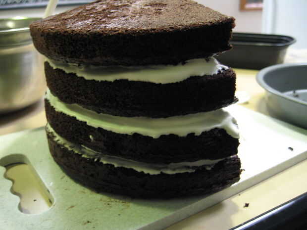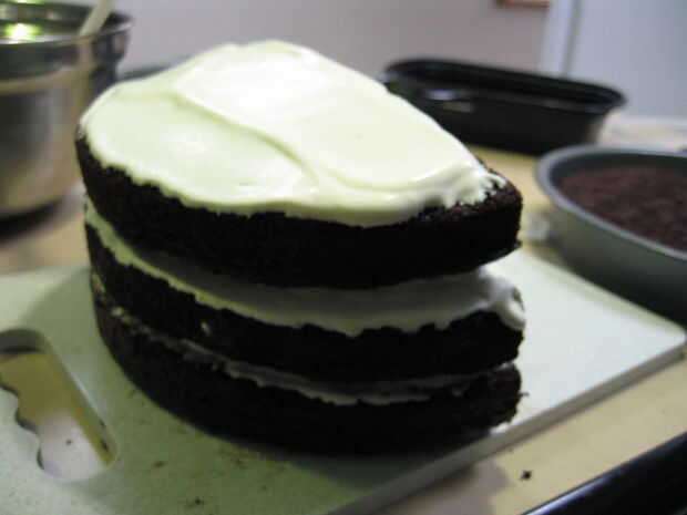 - Propagación el relleno a un grosor para que no apriete hacia fuera bajo el peso de las otras capas (muy gruesas) o exponer el pastel por debajo (muy fino). Añadir más a medida que vayas, si es necesario.