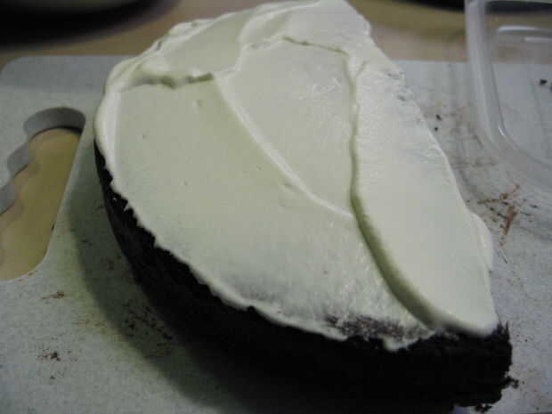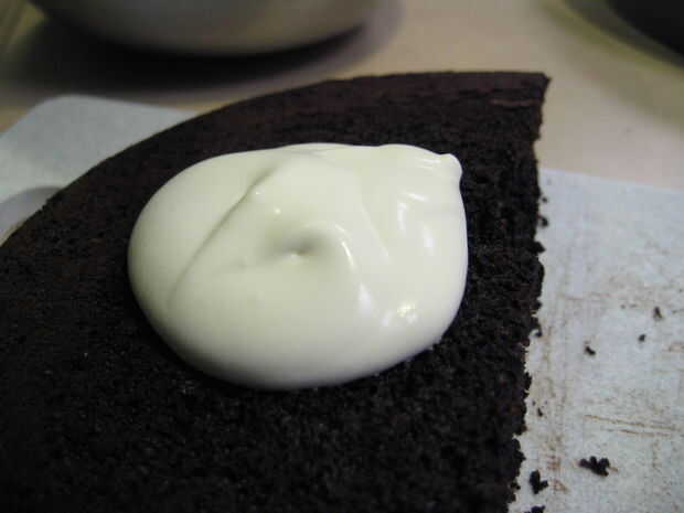 - Tomar una espátula, cuchara un tamaño pelota de golf de relleno y plop en el centro de la parte superior de la capa.