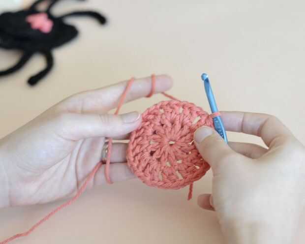 Hilera 3: Realiza 1 punto deslizado para llegar al primer espacio abierto, y luego realiza 3 cadenas como punto inicial. Luego realiza 2 varetas en el mismo espacio y 1 cadena. En cada uno de los espacios clave de la hilera anterior realizaras [3 varetas, 1 cadena]. Une con punto deslizado al igual en las hileras anteriores. Corta el hilo dejando una cola de unas 4 pulgadas de largo