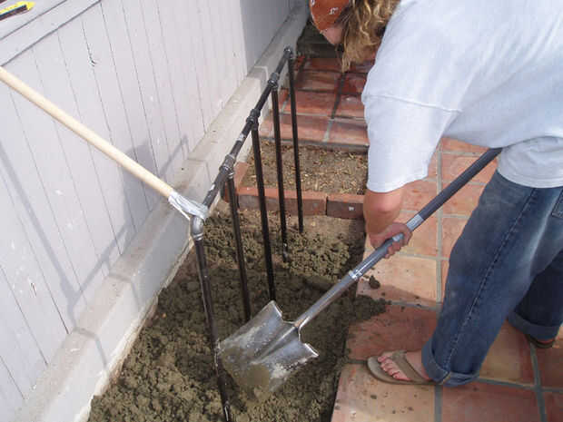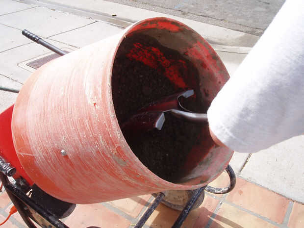 Una pala aquí realmente ayuda. Le permite tener más control sobre lo que estás haciendo. Una vez que tenga una buena consistencia va, deje que se mezcle durante unos 5 a 10 minutos. Cuando estés listo, apague el motor y mientras que una persona inclina a la mezcladora sobre, sacar el cemento y distribuir uniformemente en toda la zona de ajuste.