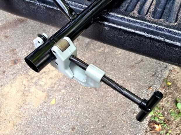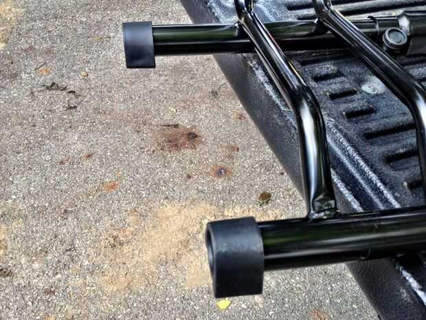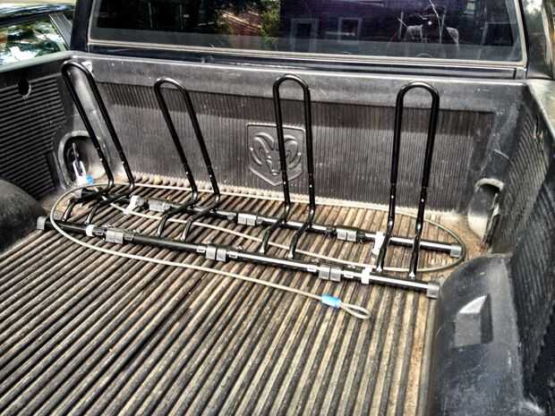 Ahora usted puede ver que el portabicicletas esté lleno de tamaño en la parte delantera y 4-5" más estrecho en la parte posterior. También cabe abso-friggen-perfectamente en la cama del camión.