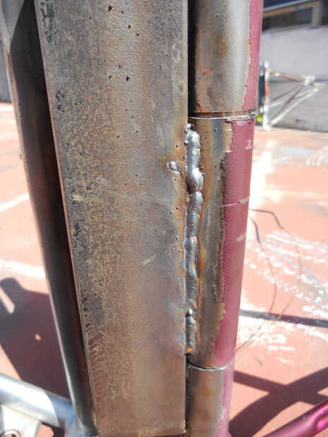 cortar el tercio medio de uno de los tubos del asiento los marcos hacia fuera. retener en su lugar y empujar la tija hacia abajo a través del tubo, manteniendo en el tercio medio del tubo mientras lo que le permite girar libremente. Esto se ser soldado con autógena como en la imagen, permitiendo la fijación soldada girar.