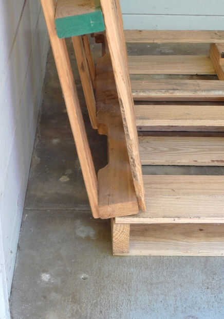 Para la plataforma que se sienta en el suelo, usted querrá un poco más meneo-espacio para la alineación de las ruedas en los listones verticales. Voy hacer esto estableciendo tablas de abajo. Como se puede ver, esto proporciona un bien para las ruedas y proporciona una llave de cruz para servir como tope, manteniendo la rueda ruede fuera de lugar. Nota en la tercer foto, la distancia de la pared en la plataforma de abajo, esto proporciona el ángulo derecho de la plataforma superior a inclinarse contra la pared (Recuerde que nosotros estamos no atornillar nada abajo... eso sería demasiado trabajo).