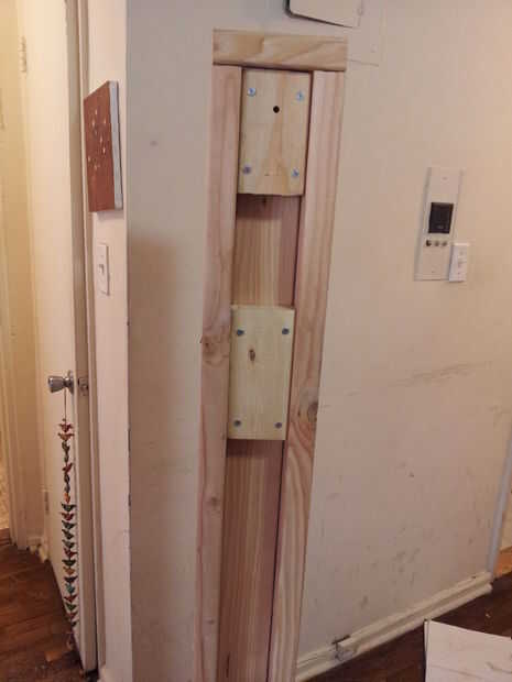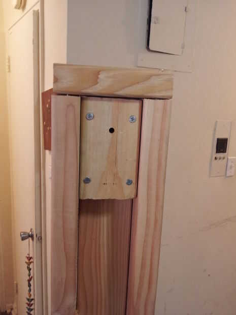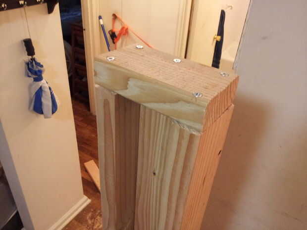 Taladre un agujero de 5/16" para colgar el gancho en un 3-6" 2 x 4. El agujero debe ser 1 1/2" de la parte superior. Sólo utiliza algunos desechos y no molesta cortarlo. Fíjela a la torre.