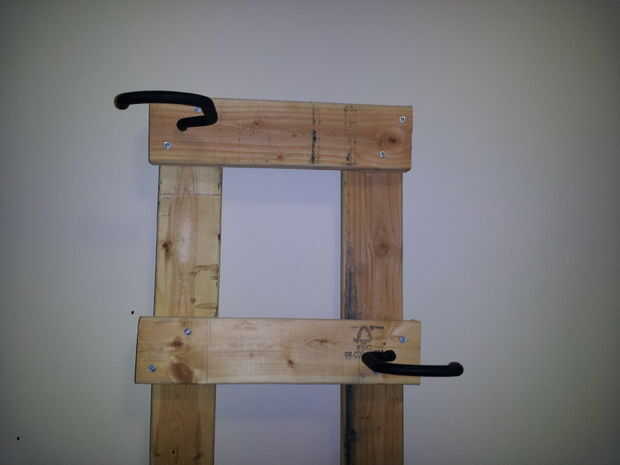 Usé algunos pedacitos de ikea para hacer una vertical portabicicletas para dos bicicletas.Algunos acción de la barra de taladro, Monte 'percha' cosas y conecte al polo de ikea.  HECHO.$60 en material, 4 horas para montar.  más barato portabicicletas
