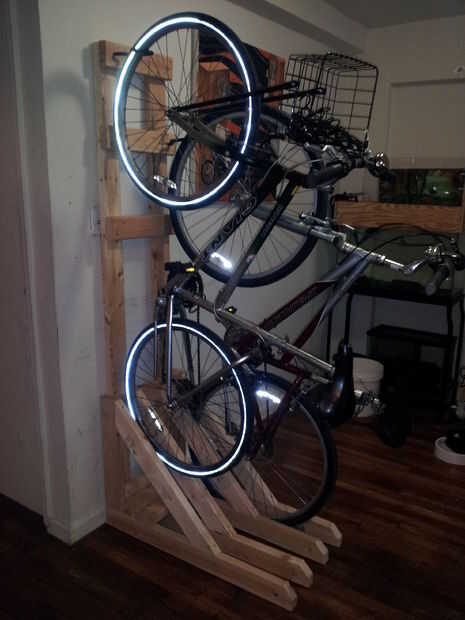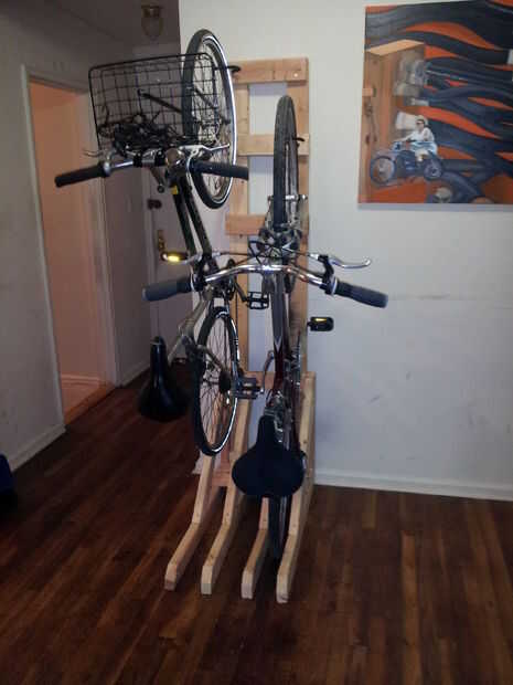 Usé algunos pedacitos de ikea para hacer una vertical portabicicletas para dos bicicletas.Algunos acción de la barra de taladro, Monte 'percha' cosas y conecte al polo de ikea. HECHO.$60 en material, 4 horas para montar. más barato portabicicletas