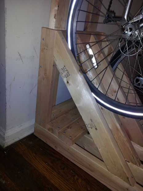 quería una manera de almacenar mis dos bicis dentro con tan poco espacio como sea posible. Vi un portabicicletas en mi tienda de bicicletas local y busqué en línea aquí . ¿$ 90? Eso es demasiado para mi gastar en algo tan simple. Pensé hacerlo de 2x4