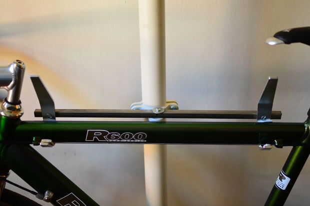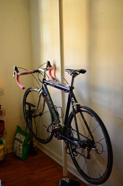 recientemente construí una bicicleta vertical desde retazos de 2x4s sobraron de otro proyecto.  Construí este estante para que la rueda trasera de una de nuestras bicicletas podría apoyar en el suelo.  Encontré que necesitaba esta moto para colgar en