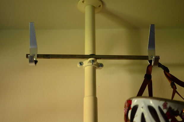 Tengo un kayak de 13 pies y un garaje lleno de gente, y almacenaje horizontal (utilizando un sistema de polea para una bicicleta) era problemático. Por suerte mi garaje lleno de gente tiene un bonito techo alto con vigas a la vista, así que pude aseg
