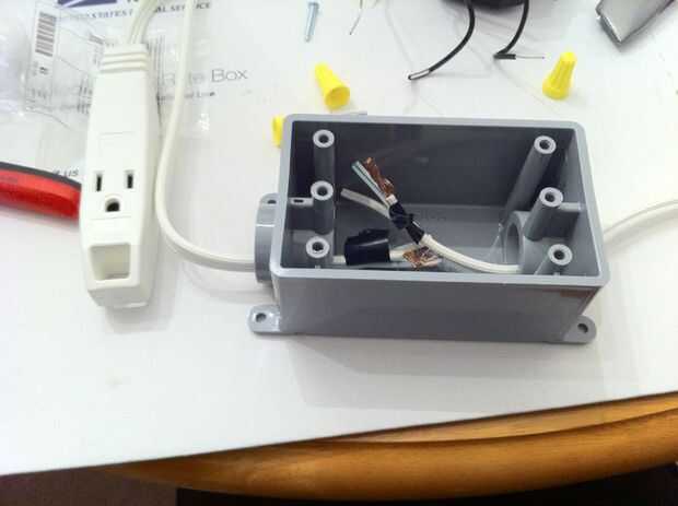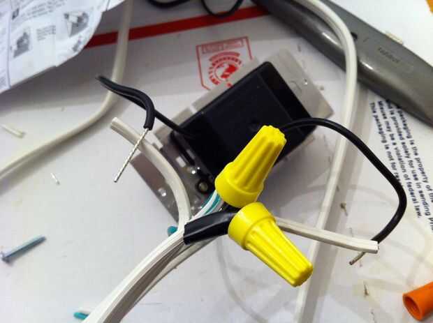 Nota que yo no hice esto en este momento, pero usted debe: anudar los cables cerca de los extremos, por lo que si has intentado tire del cable hasta el fondo de la caja sería colgar para arriba en el nudo. Se trata de un nudo de alivio de tensión. Se llama ya están poniendo la fuerza del tirón en el nudo y la pared de la caja, en lugar de las conexiones dentro. Y esto aliviará tu estrés :)