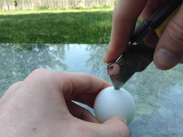2) con cuidado pinchar la pelota de ping-pong con la línea de cuchillo, en ese blanco de hobby. Usted quiere un corte no un agujero foto 3. Ahora, corte alrededor de todo el camino hasta volver a donde empezaste. Ahora tienes dos hemisferios. Repetir este proceso con la otra pelota de ping-pong.