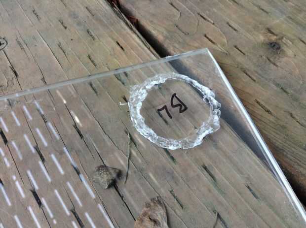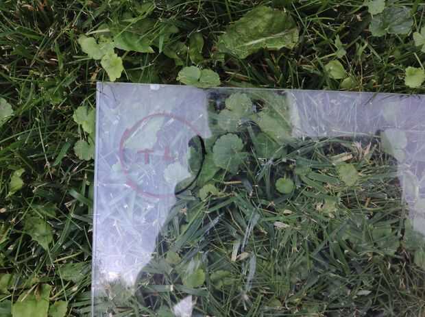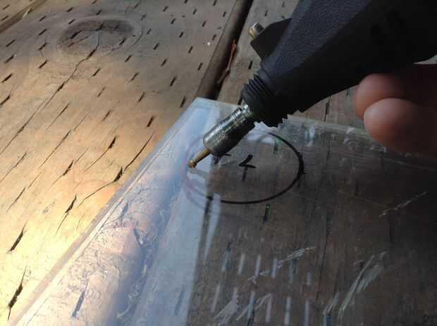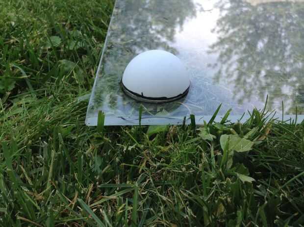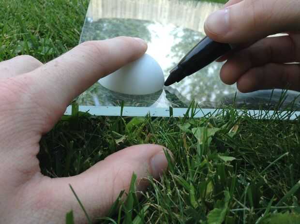 4) Coloque un hemisferio de ping pong en una esquina de la plexiglás. Mantener ligeramente el hemisferio de ping pong en su lugar (si se presiona demasiado duro, distorsionará el círculo). Utiliza el rotulador para trazar alrededor de él.