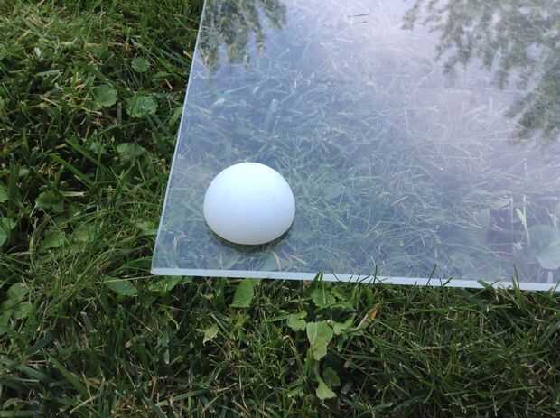 Consejo: Si añades un hemisferio de pong de ping más en el centro de la plexiglás, añadirá apoyo adicional. Asegúrese de que está a menos de un hemisferio, de lo contrario elevará la mesa de trabajo de los otros ping pong hemisferios, haciendo tambalearse la mesa de trabajo.
