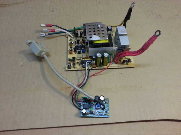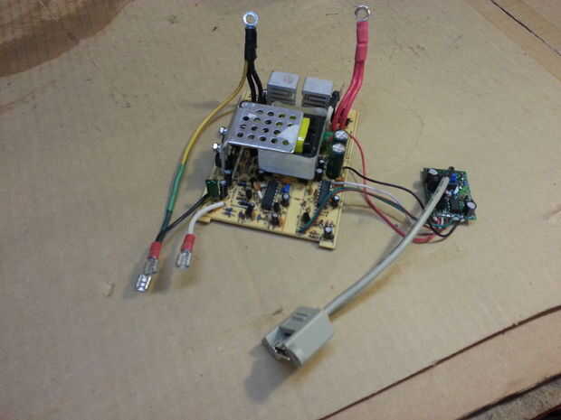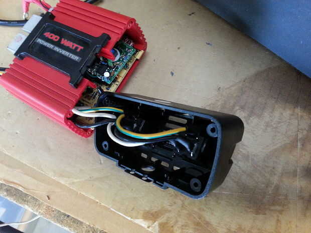 En primer lugar, desarmar el inversor de corriente DC/AC. Hay cuatro tornillos en cada tapa. Nota cómo el cableado está conectado. Corte los cables a los contactos de CA y retire del recinto. Hay pestañas que mantienen en su lugar. Desoldar los cables del tomacorriente.