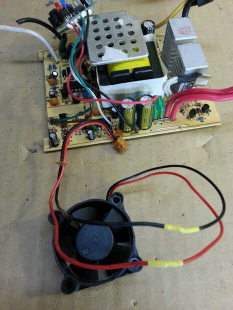 Retire el ventilador y extender los cables cerca de 6 pulgadas. Puede Agregar un encabezado opcional a la Junta y un conector para facilitar el reensamblaje. Salvar los cuatro tornillos de montaje y protector del ventilador ya que va a utilizarles.