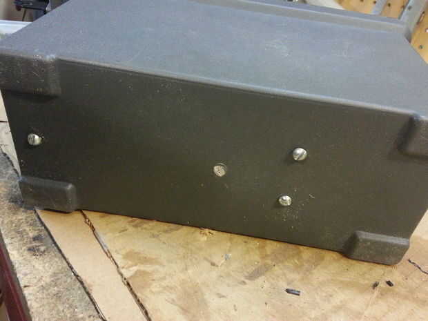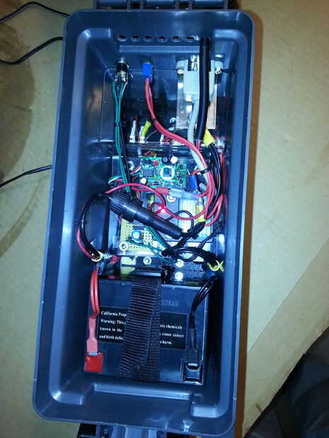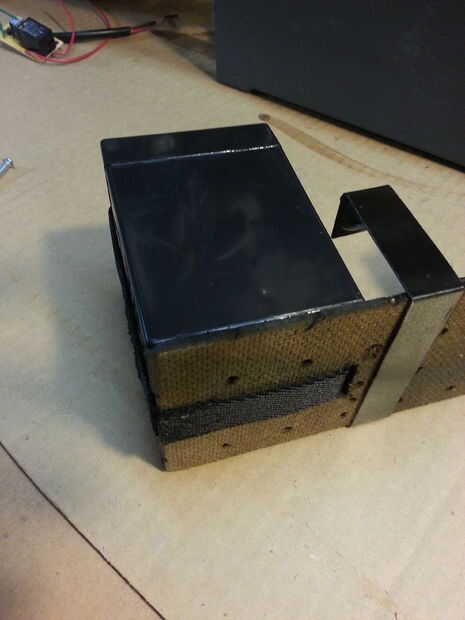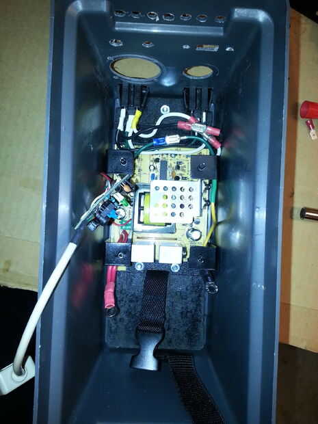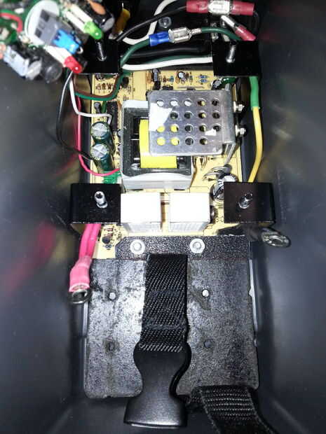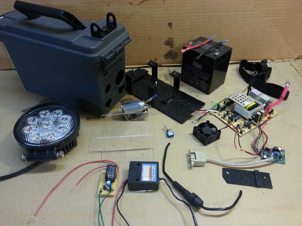 Montar todos los componentes delanteros: receptáculos de CA, ventilador, protector del ventilador, enchufe de 12V, conector de alimentación DC e interruptor. Luego colocar el tablero del inversor del poder y montar el conector USB. Con un cable de conectores crimp los receptáculos de CA y batería terminal conduce. Pase la correa de la batería a través de la placa y tornillo de la placa a la caja de munición.