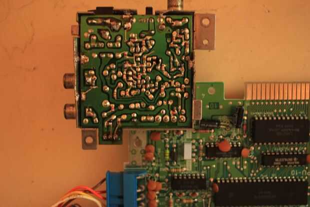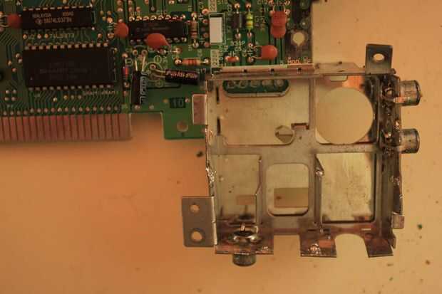 Lo siguiente que se destacó fue la caja de RF original para la consola que regula la energía entrante, amplifica la salida de vídeo y logró la salida de audio. Lo fue a manera de grandes y torpemente se colocó en la esquina de la consola así que decidí quitarlo. No era una cosa fácil de quitar así que asegúrese de que usted tome su tiempo. También hay partes que puede salvar para utilizar con otros proyectos como una parte específica necesita salvamento para éste (el regulador de tensión 7805 que puede verse en el lado de la caja de RF). Como con el puerto de expansión tomé alicates y destructivamente la quitó por desoldar y doblez lejos el blindaje metálico y ajustar la placa PCB en su interior piezas para ayudar a sacarla. Una vez que el PCB es simplemente doblar y ajustar la mayor parte de la pantalla, aunque puede que necesite usar el soldador para obtener algo de él fuera de la placa base, así como para eliminar las patillas gruesas que van en la placa base sí mismo. Tenga cuidado de calentar realmente los pines mientras que tirar hacia fuera. Cometí el error de ripeo sacarlos y dañaron las huellas y las almohadillas. Si esto sucede aunque no se preocupe, basta con seguir las huellas de aguas arriba y la soldadura de las conexiones para el primer componente en el rastro. Una vez que esté acabada si que se pueden desoldar los condensadores en la rota caja RF PCB para uso con futuros proyectos como este. Aunque Asegúrese de que usted mantenga el regulador de la caja de RF (el cuadrado negro patas tres en el lado de la caja) ya que se necesitan para reconstruir la caja de RF en un formato más pequeño.
