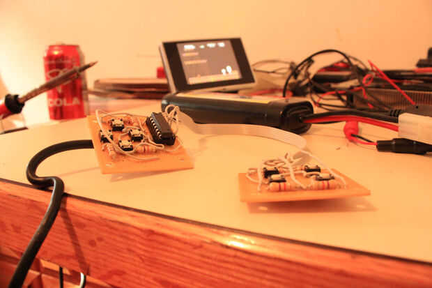 Construcción de este regulador va a ser difícil de explicar así que confiando en el esquema va a ser una necesidad. Básicamente todos de un lado de los interruptores conducen a un carril común que conduce a la patilla marrón en la IC, así como el perno inferior en el lado izquierdo. Entonces al otro lado de los interruptores en una alambre resistencias de lado y siga a través a sus respectivos pines en la IC. Desde allí al otro lado de las resistencias está conectado juntos y en el perno de la blanco. En el esquema el único lado que se muestra es el D-pad, aunque el disco de A/B/Inicio/seleccione está atado con alambre del mismo modo y luego soldado a sus correspondientes pines en el IC que he marcado porque el esquema original no los tienen. Encontré que si mantienes las resistencias tan cerca de los interruptores como sea posible ayuda a reducir el tamaño de la Junta. También utilizar cinta de cable IDE para unir los dos tableros es la forma más fácil/más limpio que he encontrado hasta ahora unir las dos medias es junto. Una vez que sus tarjetas controladoras de soldar juntos, puede tomar los pines marcados con colores y soldarlos a sus puntos de soldadura apropiadas en los juegos de PCB para el jugador 1. Lamentablemente no tengo una foto de esto (o por lo menos uno que hará de este paso cualquier más claro porque estaba usando los cables de colores no), pero si nos fijamos en el enchufe existente usted puede fácilmente imaginar que colores van en el tablero. Al principio utilizaba la interfaz existente de enchufe en la consola, pero corrí fuera de sala en mi caso para que me los quité y soldar los cables directamente a la consola del PCB. Si usted puede diseñar su propio caso recomiendo usar los puertos existentes ya pueden desconectar su controlador para otros proyectos, no sólo puede incluir un puerto de controlador femenino en tu portátil atado jugador 2 para que pueda jugar con un amigo.
