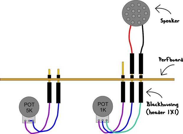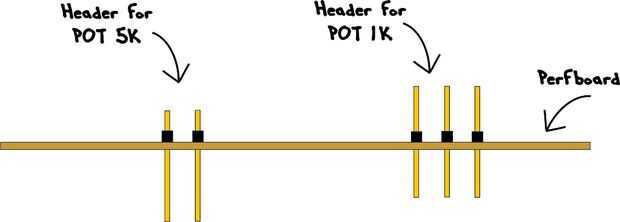 Estoy usando encabezado masculino (extendida) por potensio, fuente de energía, y para la toma de audio, así que será fácil modificar con otro valor (especialmente para lo potensio). Pero está bien si quieres derecho a la ejecución del componente de soldadura.