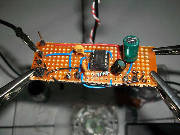 -Pin 4: Conecte a la tierra | Conecte al cable negativo de 100uF | Conecte el uno de la tapa de cerámica 0, 01uF y el otro cable va al resistor de 10 ohmios. (ver la foto del protoboard)