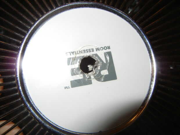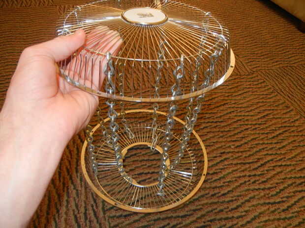 El quid de la cesta es un ventilador viejo. Usé uno del objetivo de su línea de lo esencial de la habitación. Tomé el ventilador aparte para ver cómo funcionaba y cuando le pongo nuevo juntos no gire muy rápido ya. El ventilador se convirtió en un par otros proyectos antes de encontrar una casa como esta cesta de golf de disco. El diámetro del ventilador es de 10.5" pulgadas y la relación entre ella y el diámetro de los discos mini (más adelante) es bastante fiel a una canasta real y disco. De todos modos, este ventilador funciona muy bien pero estoy seguro que usted tiene un viejo en su casa o encontrar un viejo a una buena voluntad.
