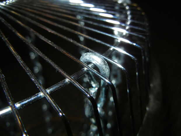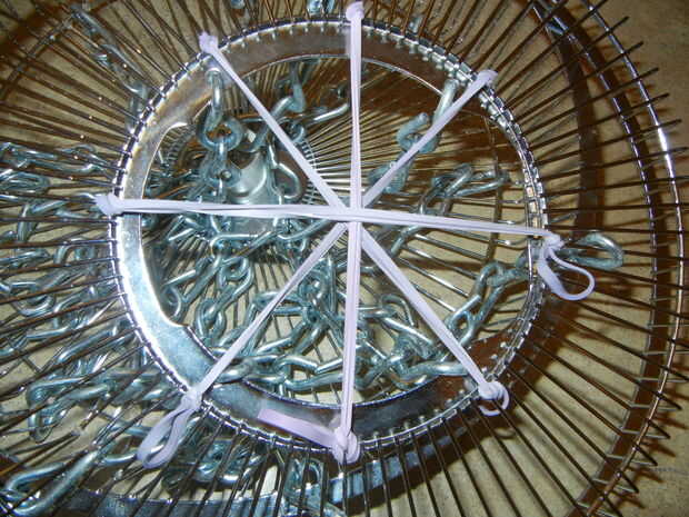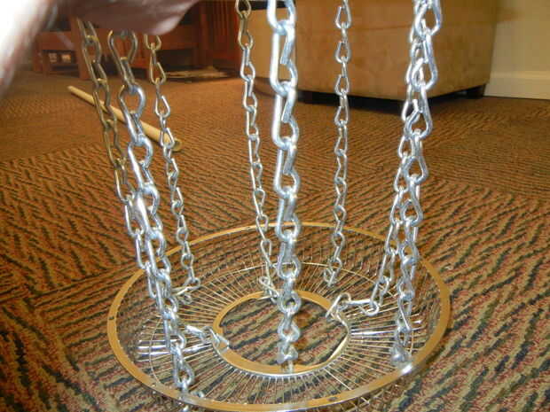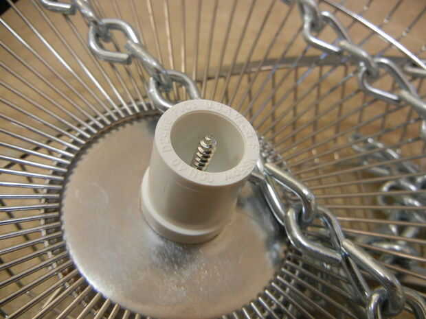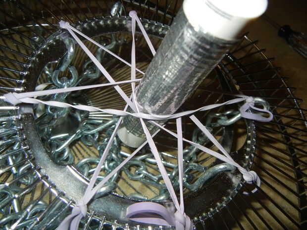 Conecte longitudes de cadena entre las secciones superior e inferior del ventilador uniformemente espaciados. Perforar un agujero en el centro de la parte superior de la cesta y conecte el soporte a la parte superior del tapón con su tornillo y arandela. Para cerrar el orificio en la parte inferior de la mitad de la cesta puede hacer lo que nunca funcionará para el ventilador. Hice un pequeño enrejado con bandas de goma que funciona muy bien. Pero un trozo de lata con un agujero cortado para el pvc tubo funcionaría así.