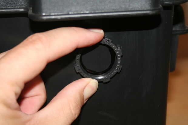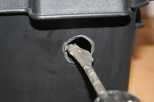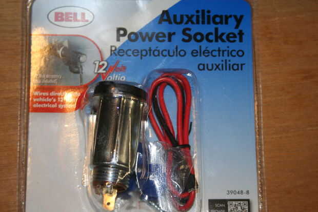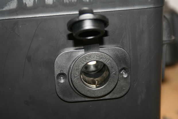 Coloque la batería en caja de la batería. Asegúrese de que hay suficiente espacio en un lado para conectar la toma de corriente auxiliar. Coloque la tapa de la caja de batería en temporalmente. Hay un labio de la resaca en la tapa que es un lugar ideal para poner el zócalo bajo. La idea es ayudar a mantener la lluvia fuera de la toma. Abra el paquete de toma de potencia auxiliar y sacar las piezas. La toma tendrá un soporte universal que puede utilizarse para marcar el agujero que debemos perforar. Poner la montura donde se desee en el cuadro. Marque el agujero y perfore. TENGA CUIDADO DE LA BATERÍA! Utilizar una cuchilla multiuso para limpiar perder plástica y para hacer el agujero más grande, si es necesario. La toma se desenrosque a dos partes. Pase el conector por el agujero (del exterior) y conecte la parte posterior de la toma desde el interior de la caja.