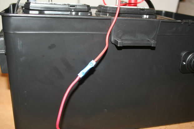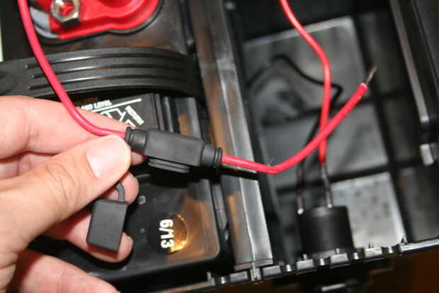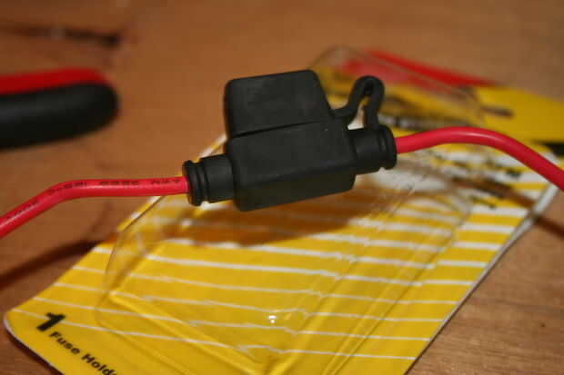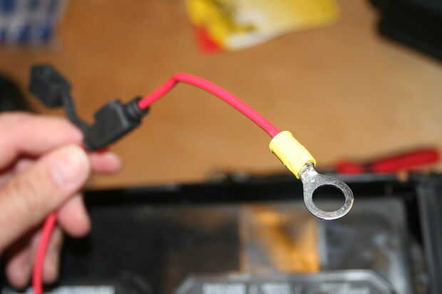 Tomar nota de que el positivo (rojo) y negativo (negro) de cables se conectan a la toma. Tome el cable positivo y extremo del empalme en el portafusibles. Tomar el anillo terminal y conecte el otro extremo del portafusible. Tome el cable negativo y conecte el terminal de anillo.