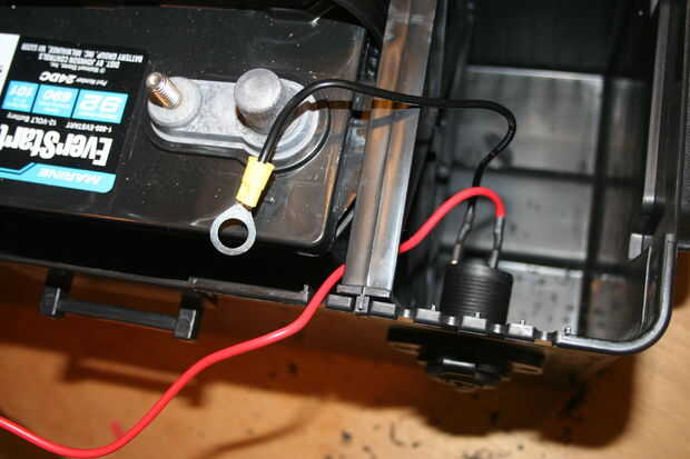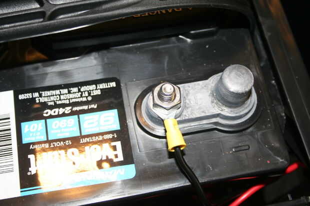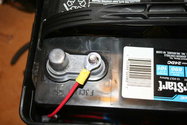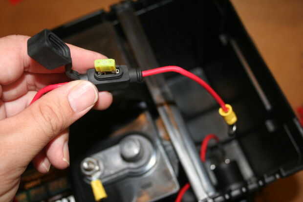 Asegúrese de que el cable negativo hará que el terminal. Si no, intente la batería alrededor de la vuelta. Añadir el fusible en el portafusibles. Conecte el cable positivo (rojo) al borne positivo de la batería y el cable (negro) negativo al borne negativo de la batería. Cierre la tapa.