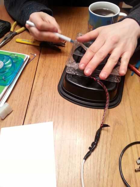Cubrí el consumo del ventilador con un filtro de café. Sólo usé poco de cinta para mantener el filtro en su lugar. Luego perfora agujeros en los cuatro orificios de montaje. Porque estaba en la entrada, el filtro se va introduciendo lo suficiente como para ser frotado por el álabe móvil. Para corregir esto, añadí una cuña doblada de una tarjeta de índice para darle más espacio/fuerza. Montado el ventilador en algunos sujetadores de goma para reducir el ruido de vibración.