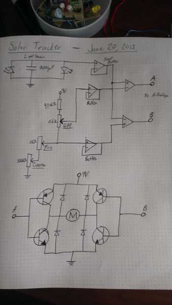 Control de la salida de la etapa de procesamiento que los transistores están abiertos en el puente en H. Cuando una va a alto, el transistor PNP cerca y el transistor de NPN se abrirán. Cuando se baja ocurrirá lo contrario. El circuito de proceso es diseñado tal que cuando A es alta, B baja y visa versa. Con una alta y B baja, una corriente pasará a través del motor de derecha a izquierda como se muestra en el esquema. Si B es alto y A es baja, la corriente pasará por el motor de izquierda a derecha. Esto hará que el motor al girar en diferentes direcciones dependiendo del estado de entrada y finalmente que el panel solar alinear directamente frente al sol.