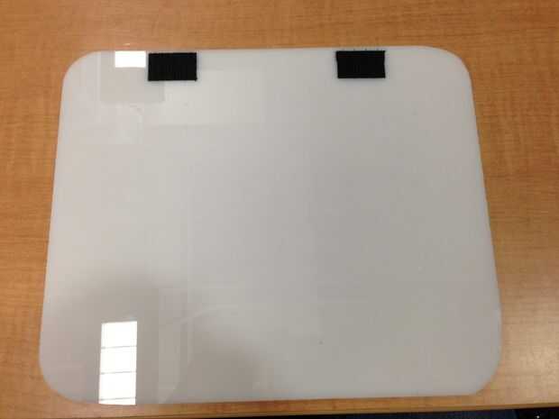 Retire el forro protector restante y presione firmemente sobre la hoja del policarbonato. La hoja debe estar centrada en la tina invertida como se muestra: