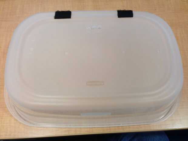 Retire el papel protector de un lado y coloque 1" tiras de cinta velcro en la parte inferior de la tina de plástico. (Recomiendo poner el lado del lazo en la parte inferior de la bañera para que no pegue a cosas cuando empacó) Lugar el desplazamiento de las tiras a uno de los lados más largos para evitar tener dos manchas oscuras en el centro de su mesa de luz.