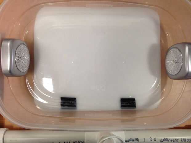 Encender luces de empujar y colocar debajo de una tina invertida para iluminar la mesa. Mesa de luz centro bajo cámara de iCubie. (véase el cuadro de conjunto en el paso 1) Una opción para reducir los puntos brillantes es colocar las luces de empuje a las paredes laterales interiores de la tina para que la luz tiene la oportunidad de difundir un poco antes de iluminar la mesa de luz. (Opcional: Si usted imprime difusores de luz, se puede colocar sobre los LEDs en la bañera para ayudar a distribuir la luz uniformemente a la mesa de luz)