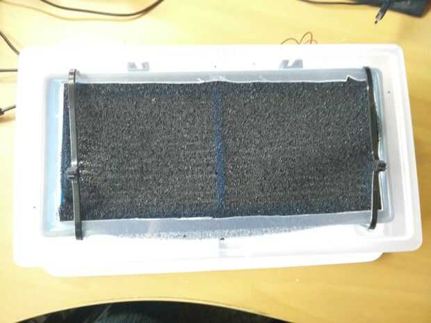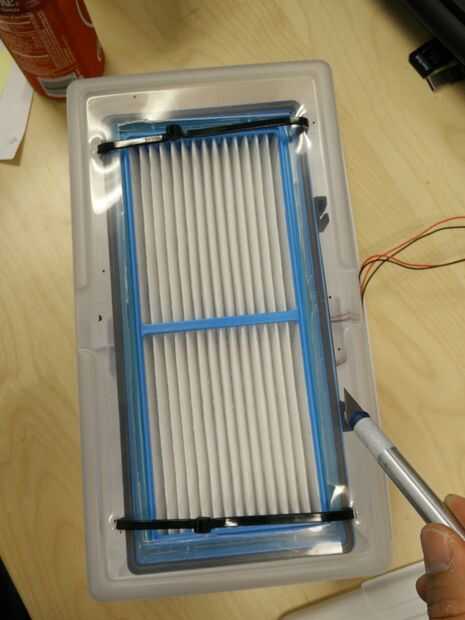 Utilice el cuchillo del exacto y el metal para cortar la forma del rectángulo para el filtro de aire HEPA.