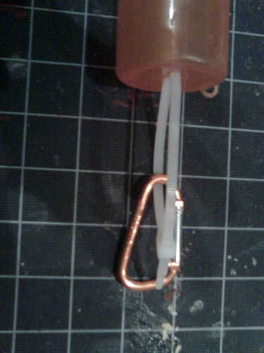 pre la amarra para hacerlo más fácil salir detrás de la botella de la prescripción de la encrespadura, luego deslice la amarra en un orificio y por el otro. Sujetar el clip llavero a la botella con el cordón.