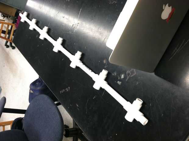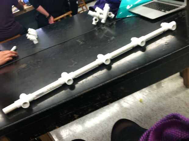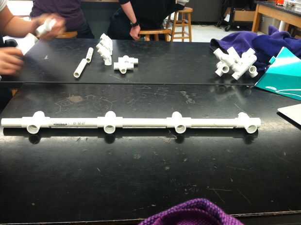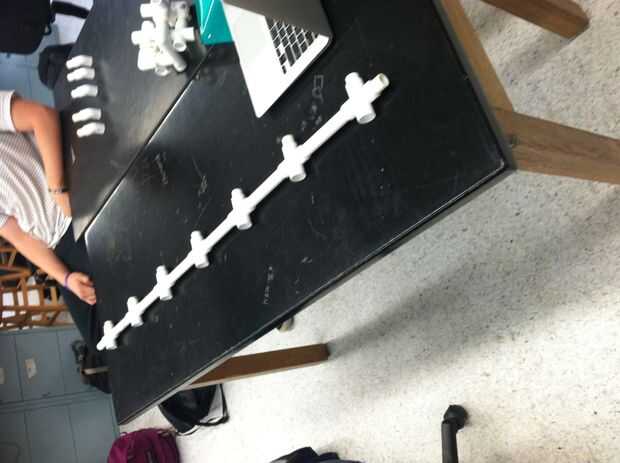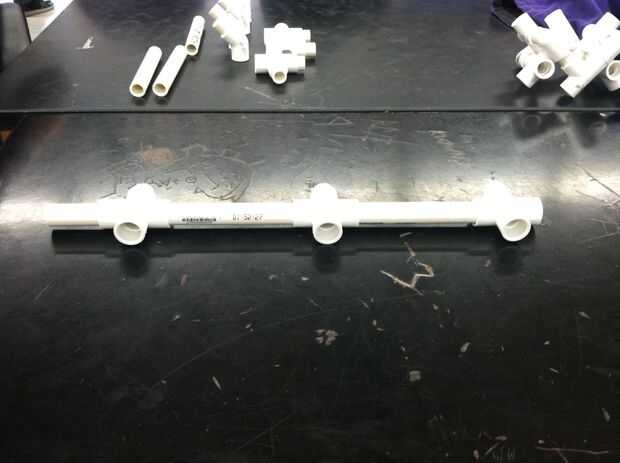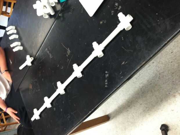 Tomar la PVC cross conectores y añadir algunas del PVC de la pipa pedazos a uno de los pares de los agujeros frente a la unos a otros. Para nuestra mesa comenzamos con uno de los tubos de PVC de 2" en lado izquierdo del conector cruzado y un tubo de PVC de 6" frente a él. Después de que fue hecho sólo continuamos el patrón de Cruz conector de tubería de PVC de 6", etc.. Asegúrese de que usted termina con el tubo de PVC. Este paso debe utilizar una tubería de 2", seis 6" tubos y seis conectores transversales.