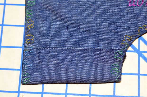 • Coser donde se indica por las líneas rojas (era difícil de ver porque mi hilo mezclado, así que añadido líneas de computadora para ayudarle)