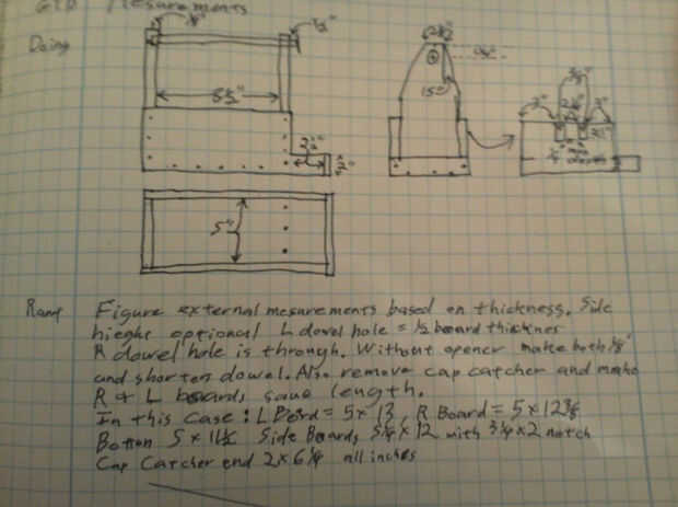 Los planes proporcionan una buena descripción de la estructura, las dimensiones críticas son en el dibujo (5x8.5 pulgadas internamente, el centro del agujero del pasador es 1,75 pulgadas desde la parte superior de placas). La mayoría de las otras dimensiones se puede variar para adaptarse a su grueso de madera o gusto personal. Los puntos en el dibujo representan cabezas de clavos. No es la pieza de extremo izquierdo, que tiene tres clavos va en la placa inferior como se muestra en el dibujo de la parte derecha. El dibujo de la derecho muestra dentro de un tablero lateral con el espacio para las muescas de separador.