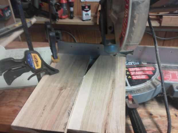 Encontrar el centro del borde superior de la Junta de extremo y marcarlo, luego marca 1 y 1/8 a cada lado. He utilizado una sierra de inglete picar asi acabo de fijar la lámina a 15 grados y llevado a cabo. Tenga en cuenta, en la foto, que el tablero inferior está sujeta a la mesa de la chopsaw. Cuando alinearon mi primer corte sujeta el tablero inferior apretado contra él. Ya que los tableros son todos el mismo ancho de la pieza es simétrica que tengo que hacer es shove el final en su lugar, cortar, darle la vuelta, corte y hecho. Si no tienes un chopsaw necesita tu transportador y trazar una línea de 15 grados de la perpendicular hasta el final a partir de las marcas 1 y 1/8 de centro y hasta que alcanza el lado, entonces el corte a lo largo de esa línea. Ver los dedos.