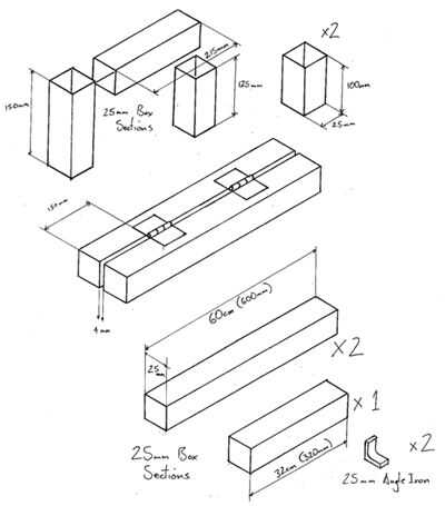 f) soldadura de las dos secciones de 100 mm en la parte posterior del bastidor, véase la imagen 6. Es importante conseguir tan paralelo como sea posible porque puestos conectados a la placa de montaje se deslizarán dentro de estas secciones.