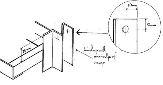c) taladrar los hierros de ángulo de 2 x 80 mm (según imagen 12) y soldar con autógena el extremo derecho de la rampa (el pedazo cortado en el paso 4-b debe alinearse con el borde interno de la rampa y ambas piezas debe atenerse hasta 25 mm sobre la cara de la rampa. Ver imagen 12.