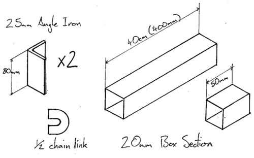 e) soldar con autógena juntos las secciones de caja 400 mm y 50 mm en forma de L al. Soldar con autógena el eslabón de cadena 1/2 en el lado del este L. Ver imagen 14.
