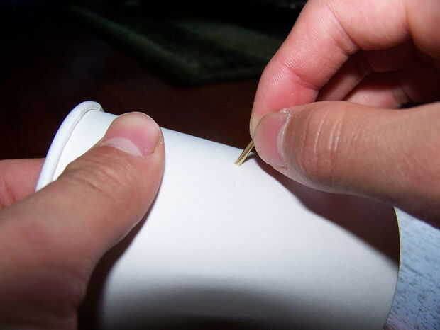 Use una taza de papel regular, usted puede encontrar. Cuanto más grande mejor. Tome un clavo (o similar) para perforar un pequeño agujero en la parte inferior de la Copa (en el lado). Tomar un cuchillo y hacer una hendidura vertical amplia. La altura de la ranura depende del tamaño de los sellos (postales).