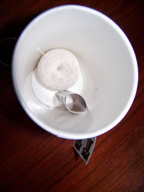 Un pequeño rollo de cuerda, poner en la taza, tomar el extremo suelto y poner en el orificio hecho por el clavo. Luego un rollo de sellos e inserte las estampillas aunque la raja.