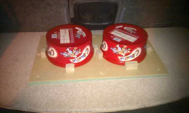 La pieza de roble son clavadas en una losa de tablero del MDF de 1/4" en cuatro áreas opuestas alrededor de la bañera (en una cara de reloj, están colocados a 12, 3, 6 y 9:00). Aseguró encajan firmemente contra los envases, para que se puedan mover en absoluto.