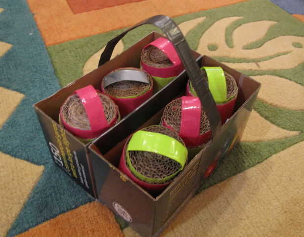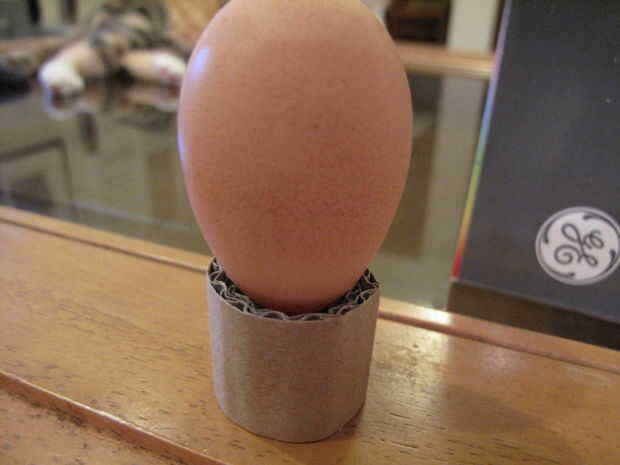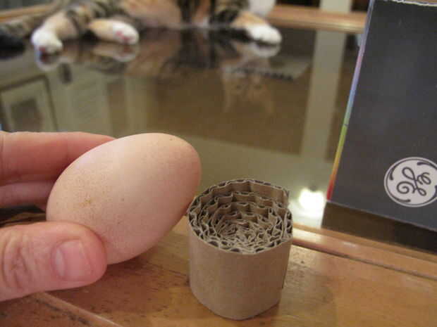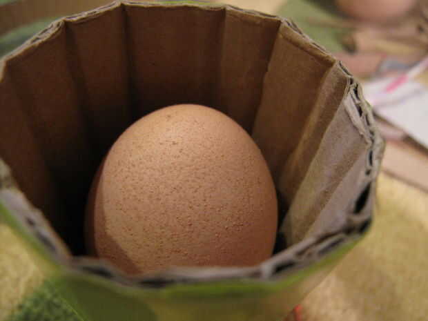 Cada huevo está anidado individualmente en una cápsula de cartón. Hice cóncavos nidos de cartón en espiral que puede ajustar fácilmente a las diferentes formas y tamaños de huevos que nuestros pollos ponen y había montado en un collar de cartón. La menor jerarquía, que sostiene el lado más grueso del huevo fue pegada en el cuello y sirve como el "fondo" de la cápsula. El nido más profundo, que tiene el lado puntiagudo, es utilizado como una tapa removible que encaja en la parte superior del cuello. Os adjunto una manija del tirón en la parte superior de la "tapa" cuando descubrí que no podía obtener mi huevo hacia fuera, después lo puse en! Afortunadamente, estaba practicando en un huevo de madera por lo que sólo podía empujar a todo sin miedo de romper el huevo.