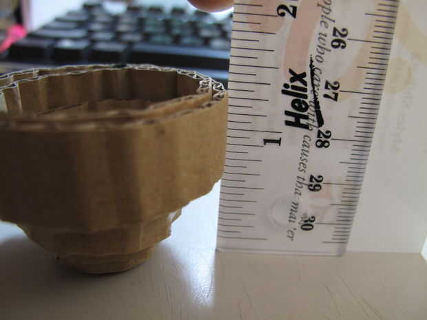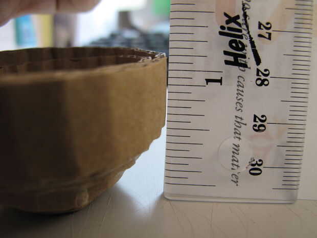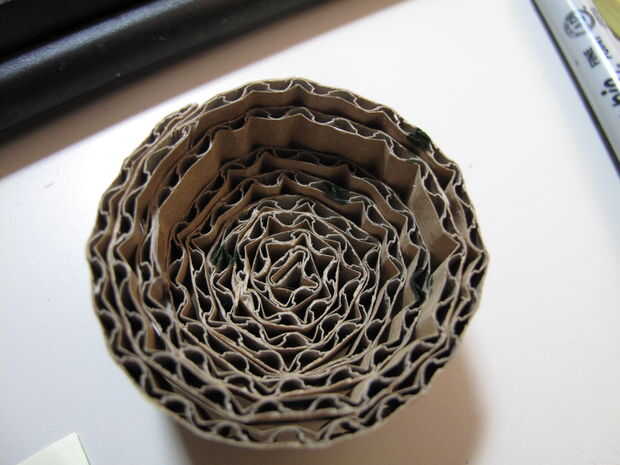 • Otra tira de 1/2 pulgada de cartón a la bobina de la cinta y continuar el enrollado y grabar como se necesita para conectar las tiras más.  Hacer esto hasta que el diámetro es de aproximadamente 2 pulgadas.  Cinta el extremo hacia abajo firmemente.  Debe poder presionar el centro y que se vea como un tazón de fuente pequeño sin ti cayendo a pedazos.