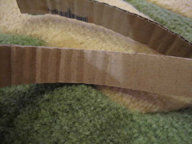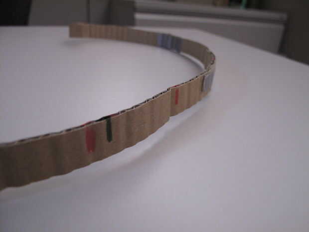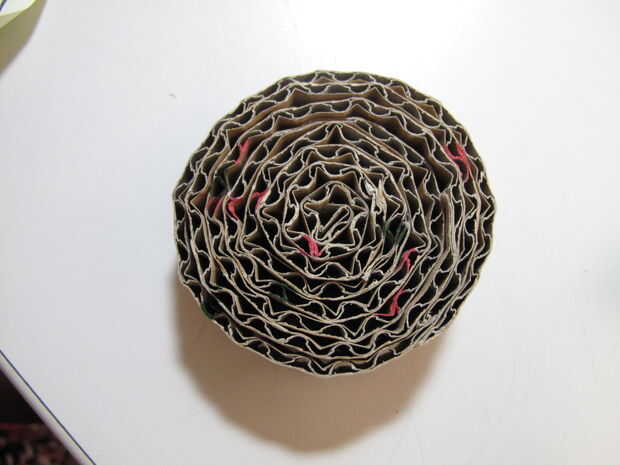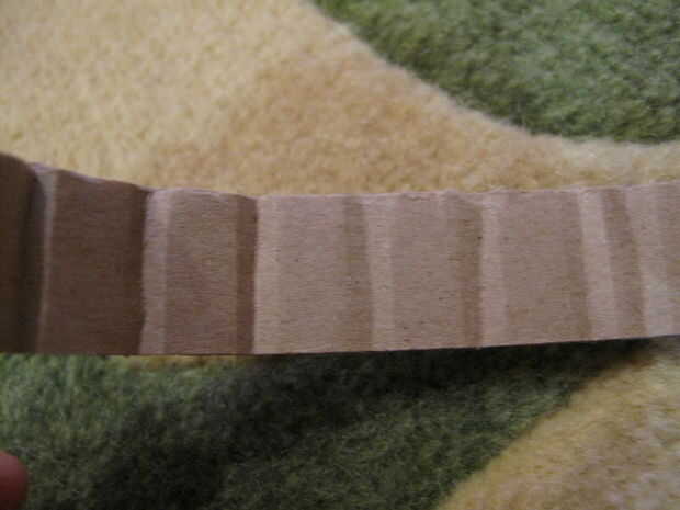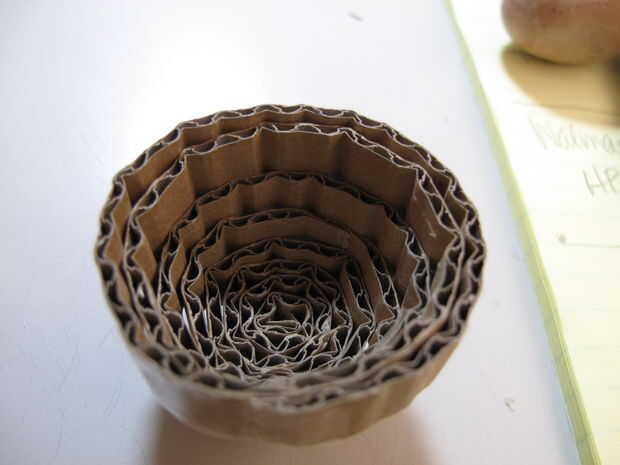 • Tomar las tiras de media pulgada de cartulina y dobla a lo largo de las olas de cartón corrugado.  Enróllela apretadamente.  Cinta adhesiva al llegar al final.  No se adhiera las bobinas.  Tienen que ser capaces de moverse independientemente una de otra para formar a las diferentes formas de los huevos.