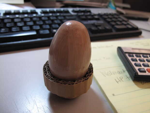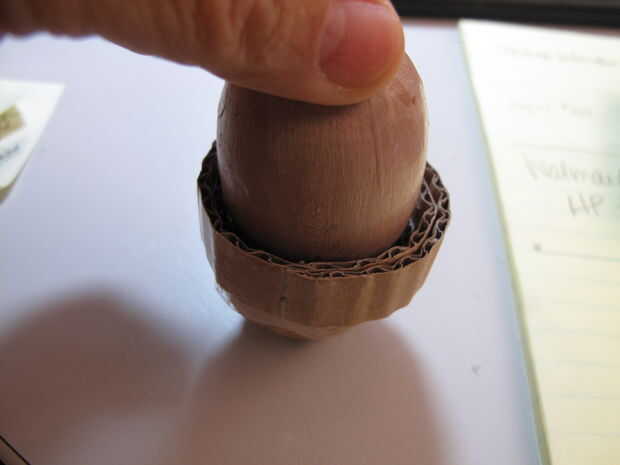 • Aplane la bobina.  Presione el lado puntiagudo del huevo en la bobina y lleve los lados para que lo apoyen.  Mida la altura de este nido.  Esto es el ancho que acabará con al hacer el nido más profundo.